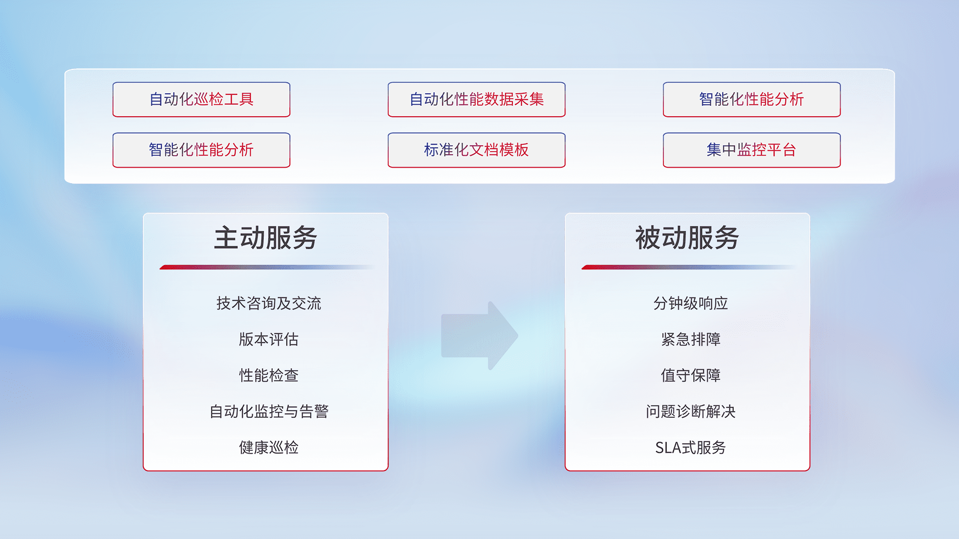 智能化工具和标准化文档,,,保障服务质量,,提供主动服务(包含技术咨询、、、版本评估、、、、性能检查、、自动化监控与告警、、健康巡检)和被动服务包含(分钟级响应、、、紧急排障、、值守保障、、、问题诊断解决、、、SLA服务)。。。。